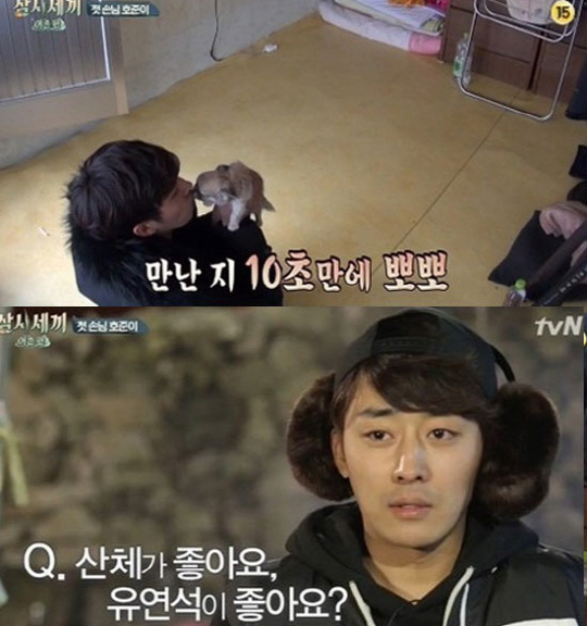 이날 방송에서 만재도에 도착한 손호준은 선배 차승원과 유해진을 마주하고는 낯을 가리며 어려워 했다. 하지만 방안에 산체와 첫 만남을 가진 손호준은 만난 지 10초 만에 뽀뽀를 퍼부으며 사랑에 푹 빠진 모습을 보였고 산체는 귀찮다는 듯 버둥거렸다.