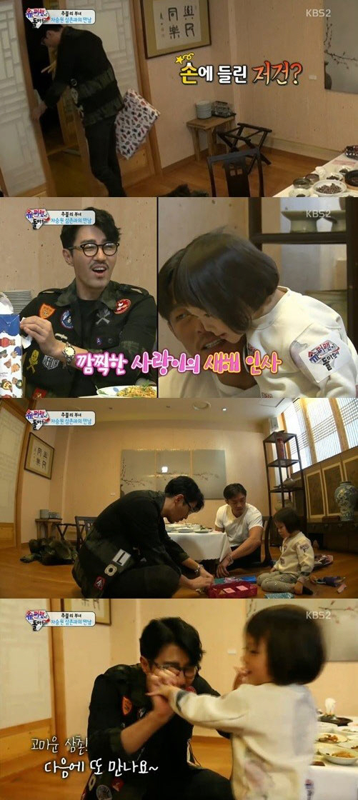 "새해 복 많이 받으세요" 배꼽인사에 트레이드마크 먹방을 선보인 추사랑의 노력에 선물 포장지가 슬슬 열리고 인형 선물이 나왔다.