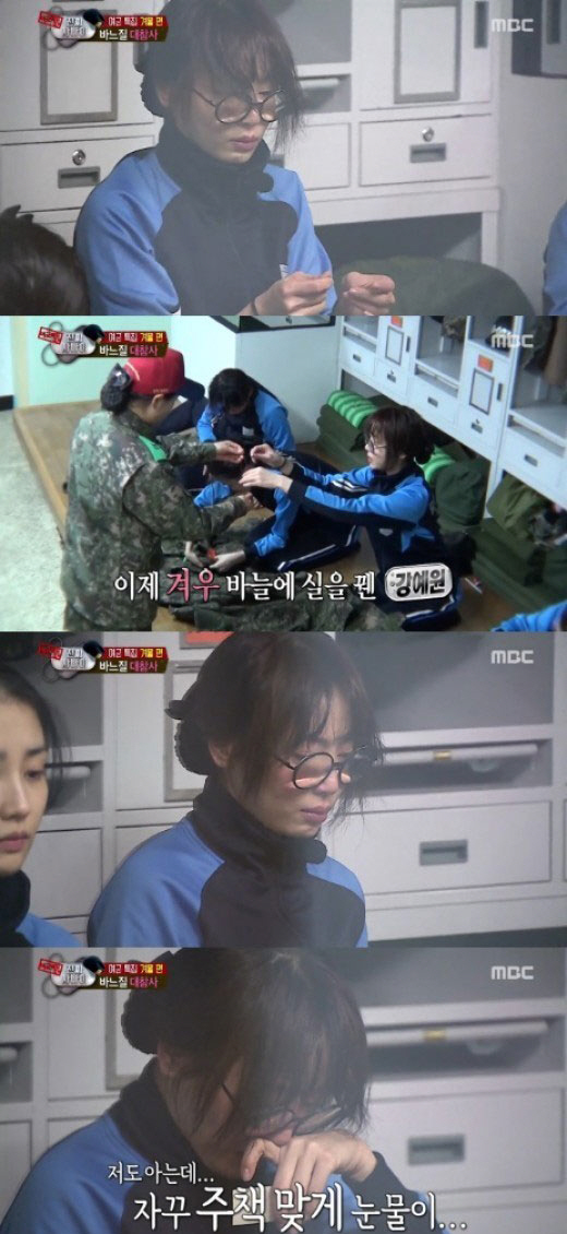두꺼운 안경을 썼지만 심각한 원시인 강예원은 '10분 안에 주기표 달기' 명령에 바늘에 실을 제대로 꿰지도 못했다.
