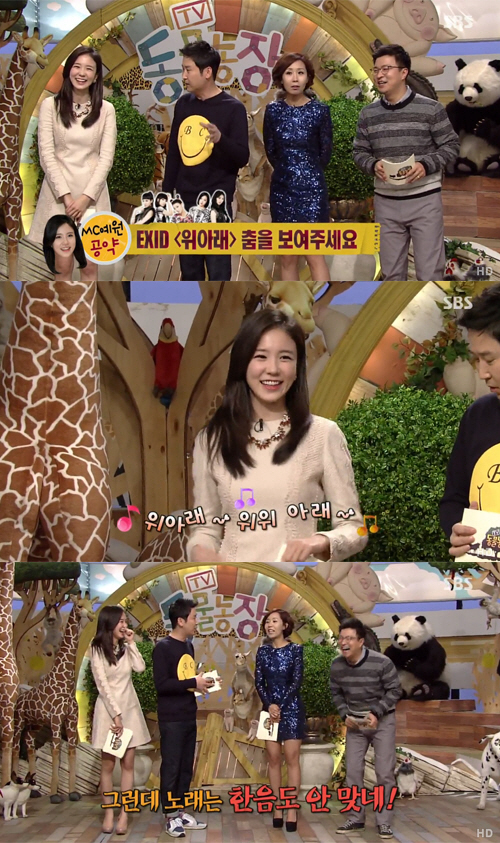 장예원 아나운서는 "동물농장 너무 힘들다"며 엄살을 피웠지만, 이내 EXID의 '위아래'가 흘러나오자 음악에 맞춰 춤을 추기 시작했다.