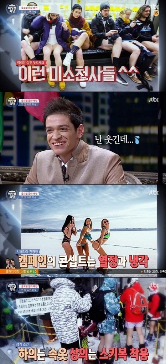 이때 일본 대표 타쿠야는 "일본에서도 바지 벗고 지하철 타는 캠페인이 벌어졌는데 많은 사람들이 참여하지 않아 흐지부지 됐다"라며 "최근에는 바지 벗고 스키 타는 사람도 있다"라고 소개했다.