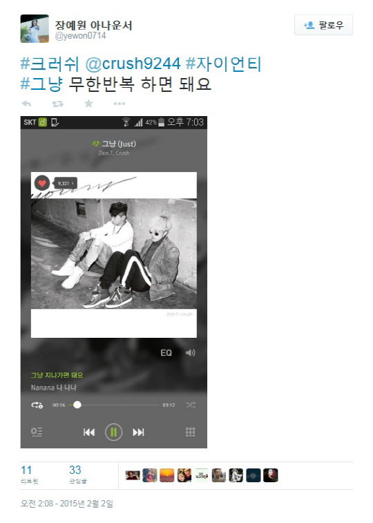 장예원은 지난 2일 자신의 트위터를 통해 "크러쉬, 자이언티 그냥 무한반복하면 돼요"라는 글과 함께 자이언티와 크러쉬의 '그냥 (Just)' 스트리밍 캡처 사진을 함께 게재했다.
