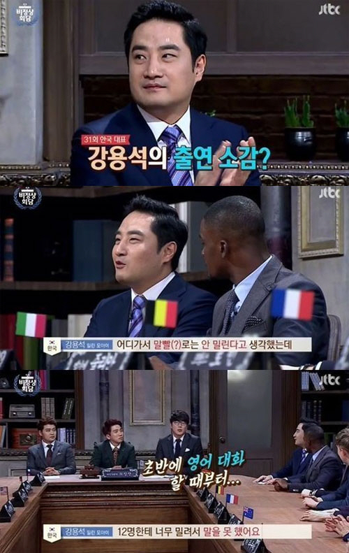 하버드 로스쿨을 졸업한 강용석은 이날 미국 대표 타일러와 영어 토론 배틀을 펼쳤다. 그러나 타일러의 장황한 영어 질문 공격에 지친 표정으로 "여기까지"를 외쳐 웃음을 자아냈다.