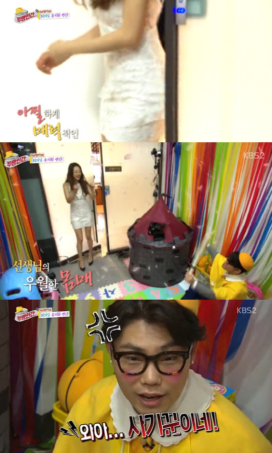 이때 최여진은 흰색의 짧은 민소매 원피스를 입고 섹시한 유치원 교사로 변신했고, 이 모습에 김범수와 강호동은 큰 환호를 보냈다.