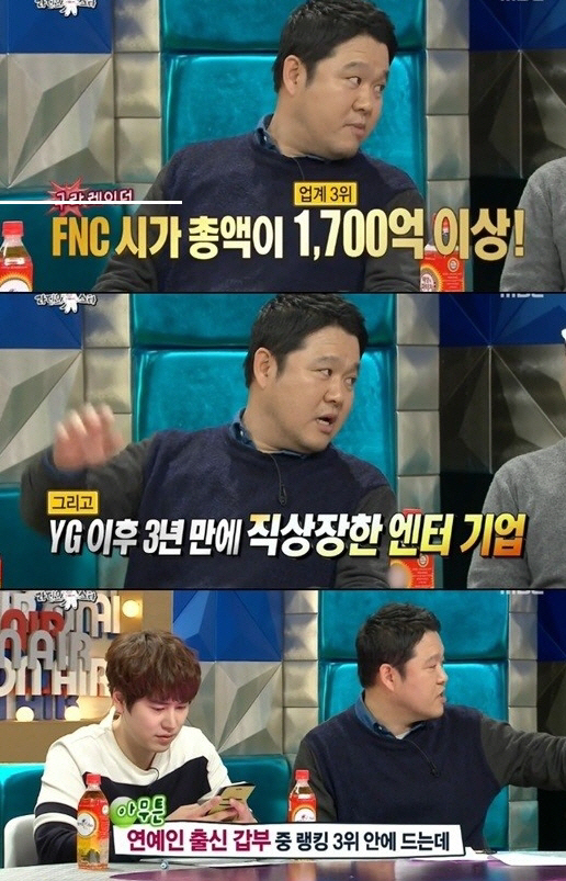'라디오스타' 김구라가 FNC 엔터테인먼트 한성호 대표가 연예인 출신 갑부 3위 안에 든다고 밝혔다.