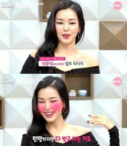 이어 이하늬는 "바디는 블렌딩 된 오일로 마사지를 한다. 잘 때 숙면을 취하게 하는 오일들만 모아서 블렌딩 된 게 있는데 자기 전에 셀프 마시지를 꼭 한다"면서, "유선 쪽이나 목선 쪽으로 한다. 민망하지만 다 벗고 한다"고 고백해 눈길을 모았다.