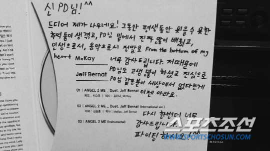 6일 정오 신곡 '엔젤 투 미(Angel 2 me)'를 발표한 맥케이 킴이 자신의 은인 가수 신승훈에게 애교 만점 자필 편지를 전했다.