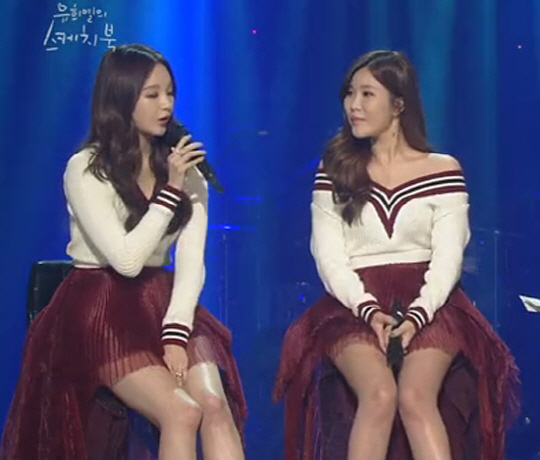 이날 다비치는 어깨를 노출한 니트에 각선미가 드러나는 반전 미니스커트를 입고 무대에 섰다.