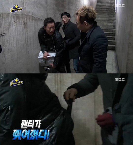 '무한도전' 유재석이 정준하의 팬티를 찢어버리는 참사가 벌어지며 웃음을 자아냈다.