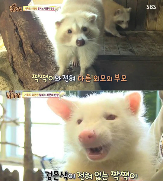 8일 SBS '동물농장'에서는 분홍빛 발과 코를 제외하곤 온통 순백색으로 뒤덮인 알비노 라쿤 짝짹이의 성장기가 방송됐다.