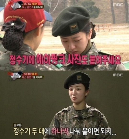 이날 퇴소를 앞두고 윤보미는 소대장에게 "마지막 부탁이 있다"고 말했다. 윤보미는 고개를 숙인 채 "정수기에 에이핑크 사진도 붙여주세요"라고 소대장에게 말했다.