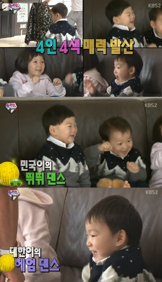 이날 방송에서 사랑이과 삼둥이는 4인조 바라밤 댄스를 선보였다. 앞서 삼둥이의 '바라밤댄스'에 이어 추사랑까지 가세한 것.