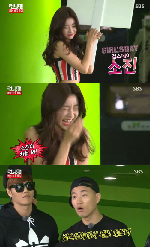 이날 걸스데이 소진은 히트곡 '달링'과 함께 등장하며 깜찍한 안무를 선보여 '런닝맨' 멤버들의 환호를 받았다.