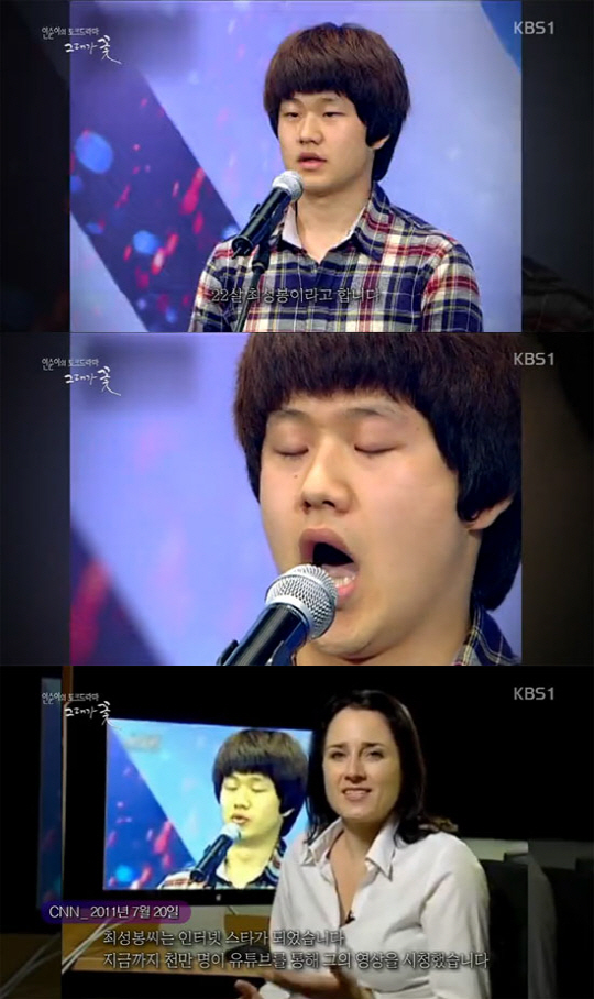 9일 방송된 KBS1 '그대가 꽃'에서는 2011년 '코갓탤' 화제의 주인공 송윤아·박칼린을 울린 '껌팔이 소년' 최성봉의 이야기가 그려졌다. 유흥가 뒷골목을 누비던 '껌팔이'에서 전 세계를 감동시킨 '한국의 폴포츠'가 되기까지 사연이 공개됐다.