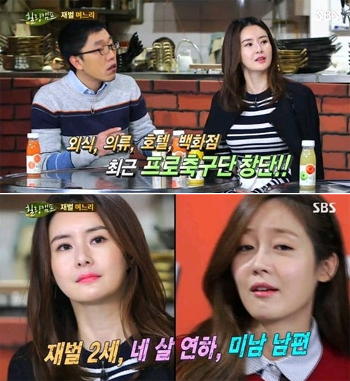 또한 MC 성유리는 "재계서열이 44위라더라"며 "진짜 재벌 며느리다. 또한 재벌 2세에 4살 연하, 게다가 미남인 남편을 만났다"며 부러워했다.