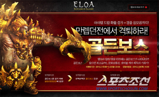 '골든보스 이벤트'는 40레벨 이상 이용이 가능한 만랩 던전(일반?영웅)에 확률적으로 등장하는 골든보스 몬스터를 처치하고 푸짐한 상품을 받을 수 있는 이벤트로 오는 2월 23일까지 진행한다. 해당 던전에서 골든보스를 물리치면 경품 응모권을 획득할 수 있으며, 이를 통해 이용자들은 고급 PC세트, 넷마블캐쉬, 문화상품권, PC방 무료 이용권, 한정판 아이템 '전장의 날개' 등 원하는 경품에 응모할 수 있다.