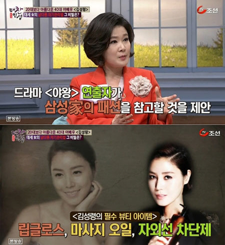 백은영 기자는 "김성령은 거의 피부과에 매일 간다. 만약 못 가게 되면 오일로 전신 마사지를 하고, 낮은 베개를 사용해 목주름을 방지한다"면서 "김성령은 필수 뷰티 아이템으로 립글로즈, 마사지 오일, 자외선 차단제를 꼽았다"고 설명했다. <스포츠조선닷컴>