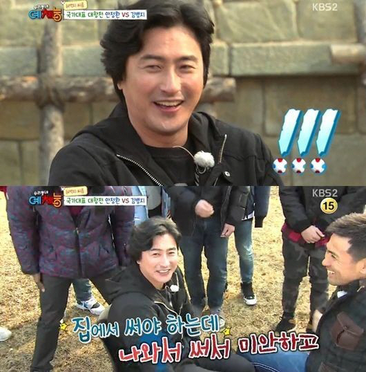 이날 방송에서는 전 국가대표 축구선수 안정환과 김병지가 자존심을 건 허벅지 씨름 대결을 펼치는 모습이 공개돼 시선을 모았다.