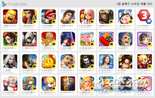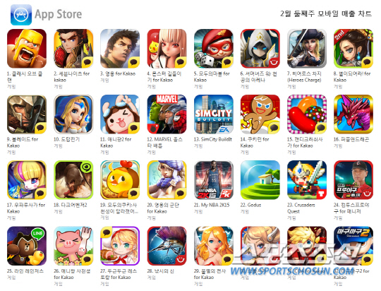 영웅의군단은 중위권 내의 하락세를 끊고 반등에 성공하면서 20위에 안착했다. 21위부터는 해외 게임들과 컴투스 게임들, 신작 등이 자리를 잡았다. 그 중 라인의 게임 플랫폼으로 서비스 중인 라인레인저스가 매출 25위에 오르면서, 유저들은 물론 관계자들의 이목을 끌었다. 라인레인저스는 대대적인 TV CF를 앞세워 게임 알리기를 본격적으로 시작한 만큼 향후 순위 변동에 주목해 볼만하다.
