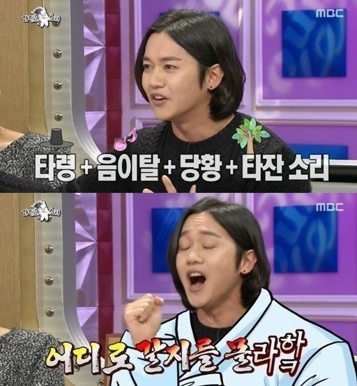 강균성은 "'난 여자가 있는데'를 부르는데 그날 따라 목 상태가 안 좋았는지 성대가 위에 붙었다"면서 "첫 시작을 불안하게 하더니 브릿지 부분에서 타령, 음이탈을 하고 당황해서 입을 막은 후 다시 타잔 소리를 냈다"고 설명하며 성대모사를 해 스튜디오를 초토화시켰다.