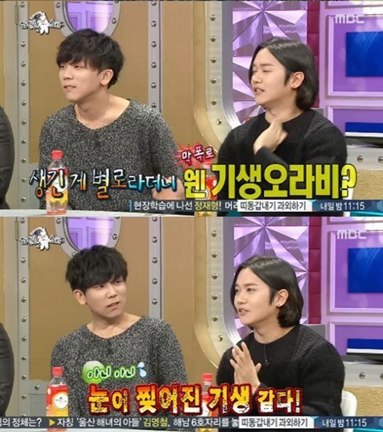 이날 강균성은 '여자에게 가장 인기가 없을 것 같은 사람은 누구일 것 같느냐'는 MC들의 질문에 정기고를 꼽았다. 그는 "노래는 잘하는데 생긴 것은 별로"라며 솔직한 돌직구를 날려 정기고를 당황하게 만들었다.
