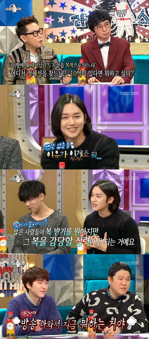 또 강균성은 '10억이 있으면 뭘 하고 싶은가'라는 질문에 대해서는 "많은 사람들은 복 받기를 원하지만 그 복을 감당할 실력이 안 된다. 복을 원하기보다는 그것을 감당할 수 있는 그릇이 먼저 돼야 한다"며 한껏 진지한 분위기를 형성했다.