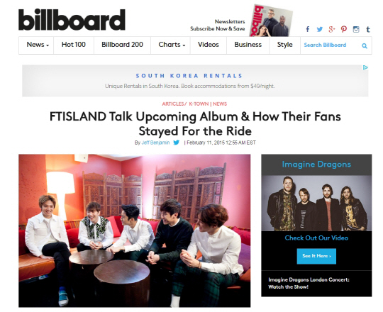 최근 빌보드는 'FT아일랜드 곧 발매할 앨범과 그들 곁을 지켜준 팬들에 관해 이야기하다(FTISLAND Talk Upcoming Album&How Their Fans Stayed For the Ride)'라는 제목의 칼럼을 게재했다. 지난 2일 FT아일랜드의 첫 유럽-북남미 투어 '2015 FT아일랜드 [FTHX] Live'의 뉴욕 공연에 대해 호평한 칼럼을 게재한 데 이어 다시 한 번 그들의 음악적 정체성에 대한 심도 깊은 인터뷰를 내놓으며 관심을 표현했다.