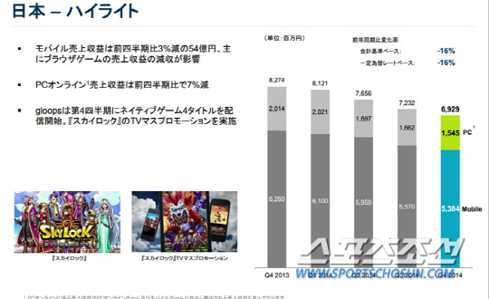 이번 실적 부진의 가장 큰 영향은 일본의 글룹스의 부진 때문이었다. 넥슨 홈페이지에 공개된 실적자료를 살펴보면 글룹스는 110억엔(약 1,043억원)의 손상차손이 발생했고 주력이었던 모바일 브라우저 게임들의 부진이 큰 영향으로 작용했다. 지난해부터 일본 내에서의 실적 하락세가 눈에 띄게 나타나고 있는 것은 현재 가장 큰 고민거리. 2015년 넥슨은 글룹스를 통해 5종의 신작을 출시하고 라인을 통해 영웅의 군단을 출시하는 등의 목표를 공개했다.