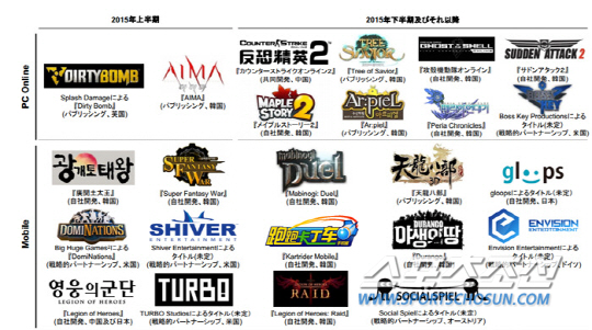2015년 상반기에는 온라인게임 아이마, 더티봄이 출시 예정 타이틀로 공개됐고, 2015년 중으로 트리오브세이비어, 공각기동대 온라인, 서든어택2, 메이플스토리2, 수신학원 아르피엘, 페리아 연대기, 보스키 프로덕션의 신작 등이 출시를 준비하고 있다. 모바일게임 역시 광개토태왕을 비롯해 마비노기 듀얼, 듀랑고 등이 한국에 출시되고 도미네이션스, 영웅의군단, 터보 스튜디오, 소셜 슈펠 등과 제휴한 신작들도 글로벌 시장에 출시될 예정이다.