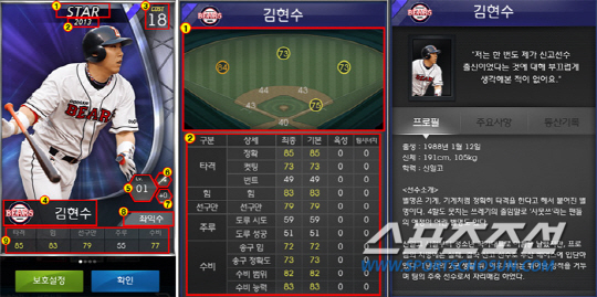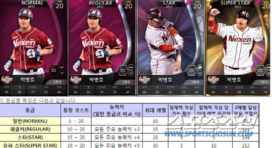 카드를 기본으로 한 야구 시뮬레이션 게임에서 카드의 다양성은 두말이 필요 없을 정도. 기본 등급은 일반-레귤러-스타-슈퍼스타의 4등급이다.