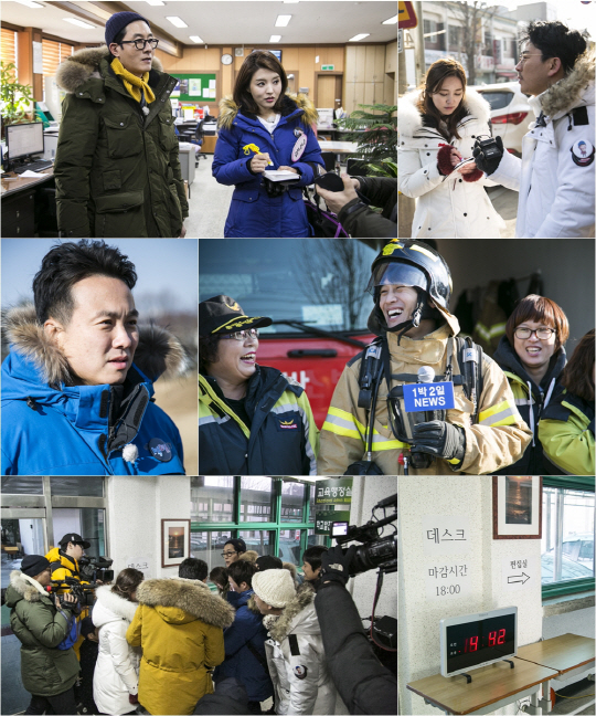 최근 경기도 이천 백사면에서 진행된 '1박2일' 녹화에서 멤버들은 본격 취재 대결을 펼쳤다. 김주혁-김나나 기자, 김준호-김빛이라 기자, 차태현-이재희 기자, 데프콘-강민수 기자, 김종민-김도환 기자, 정준영-정새배 기자 등 6팀은 특종거리를 찾기 위해 취재경쟁을 벌이는 한편 마감시간을 지키기 위한 전쟁 같은 시간을 보냈다. 이들은 취재경쟁에 돌입하자 "생각하는 게 똑같아"라며 누가 먼저랄 것 없이 백사면사무소에 집결했다. 또 더 좋은 기사를 얻기 위해 취재원을 숨기고 밀담으로 정보를 캐내는 등 신경전을 벌였다. 이후 취재 과정에서 기자들은 "360도 관찰력이 필요하다", "정보원이 중요하다"는 등 노하우를 전수하며 각자의 방식대로 멤버들을 조련했다. 하지만 몇몇은 "먼저 시범을 보여달라"는 등 티격태격, 현장을 폭소케 만들었다는 후문.