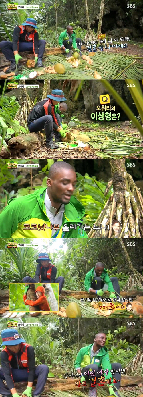 이후 샘 오취리는 "이상형이 어떻게 되느냐"는 제작진 물음에 "코코넛나무 올라가는 여자"라고 앞서 코코넛나무 오르기에 성공한 윤세아를 지칭하는 발언을 했다.