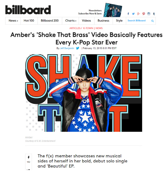 미국 유명 매체 빌보드는 지난 13일(현지 시간) K-POP 칼럼 코너 K-TOWN을 통해 "엠버의 'SHAKE THAT BRASS' 뮤직비디오에는 많은 K-POP스타들이 출연한다(Amber's 'Shake That Brass' Video Basically Features Every K-Pop Star Ever)'라는 제목의 기사를 게재하고, 이번 앨범과 뮤직비디오를 자세히 소개해 엠버의 글로벌한 위상을 확인케 했다.