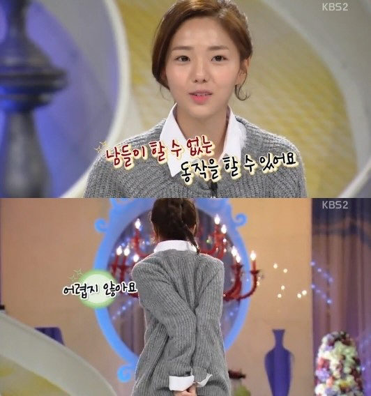 이날 채수빈은 "팔꿈치끼리 닿는다"며 독특한 개인기를 선사했다. 그는 "남들보다 팔다리가 유연하다. 그래서 남들이 못하는 동작도 가능하다"며 팔을 뒤로 돌려 팔꿈치끼리 닿는 동작을 선보였다.