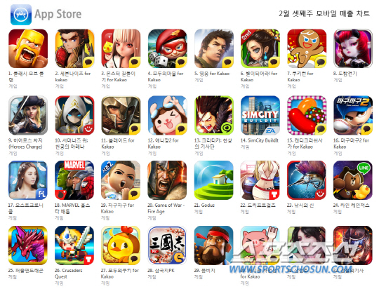 애플 앱스토어의 경우에도 구글 플레이 스토어와 상황은 비슷했다. 433의 영웅이 3위에서 5위로 밀리면서 다른 게임들이 한 계단씩 올라섰으며 서머너즈워: 천공의 아레나도 5위에서 10위로, 히어로스 차지도 7위에서 9위로 떨어진 모습을 볼 수 있었다. 지난주 해외 게임으로는 좋은 성적을 유지해 매출 10위권 진입을 눈앞에 둔 마블 올스타 배틀과 심시티 빌드잇은 기세가 한 풀 꺽여 각각 12위에서 18위로, 13위에서 14위로 밀렸다.