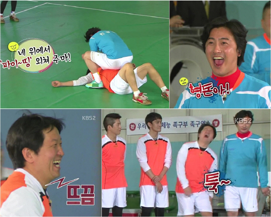 KBS2 '우리동네 예체능' 족구편에 출연 중인 안정환과 정형돈은 각각 블루팀과 오렌지팀 주장으로 경기를 펼치며 시종일관 앙숙 케미로 깨알 같은 재미를 선사하고 있다.