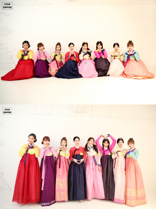 공개된 사진 속 다채로운 빛깔의 고운 한복을 차려 입은 나인뮤지스 멤버들은 세배를 하듯 두 손을 모으고 앉거나 손가락으로 하트를 그리며 카메라를 응시하고 있다. 특히, 멤버들이 하트를 그리며 서 있는 사진은 멤버들의 큰 키를 증명하듯 끝없이 긴 치마길이에 더욱 눈길이 간다.