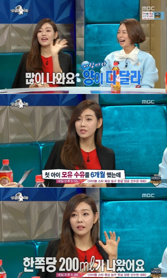 박탐희는 "첫 아이를 모유 수유 6개월을 했다. 모유가 한쪽당 200ml가 나왔다. 그래서 체중이 출산한 지 3개월 만에 원상복귀 됐다"고 설명했다.