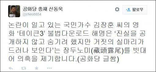 신동욱 총재는 20일 트위터를 통해 "불법 다운로드 논란이 일고 있는 국민가수 김장훈 씨의 영화 '테이큰3' 불법다운로드 해명은 '진실을 공개하지 않고 숨기려 했지만 거짓의 실마리가 드러나 보인다'는 장두노미(藏頭露尾)를 빗대어 의혹을 제기합니다"라고 주장했다.