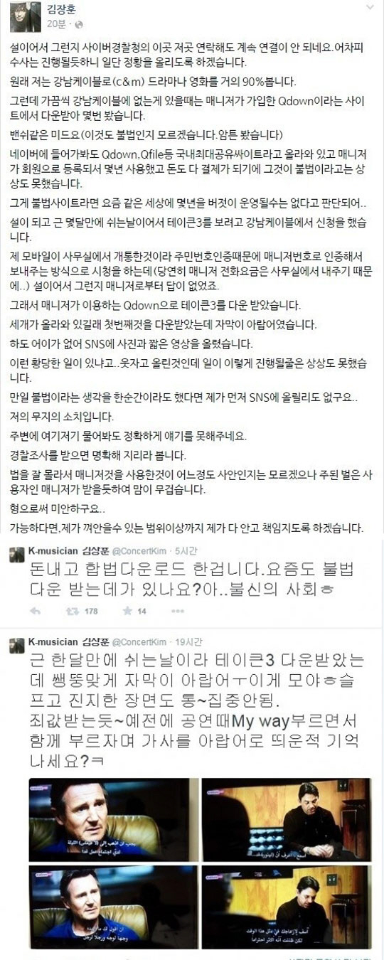 김장훈은 지난 20일 자신의 SNS에 "불법인줄 모르고 다운받았다"라며 "몇년간 유지되는 사이트라서 불법인줄 몰랐다. 경찰조사를 받겠다"라고 밝혔다.