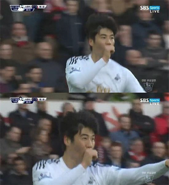 이후 기성용은 엄지손가락을 입에 무는 일명 '젖병 세리머니'를 선보였다.