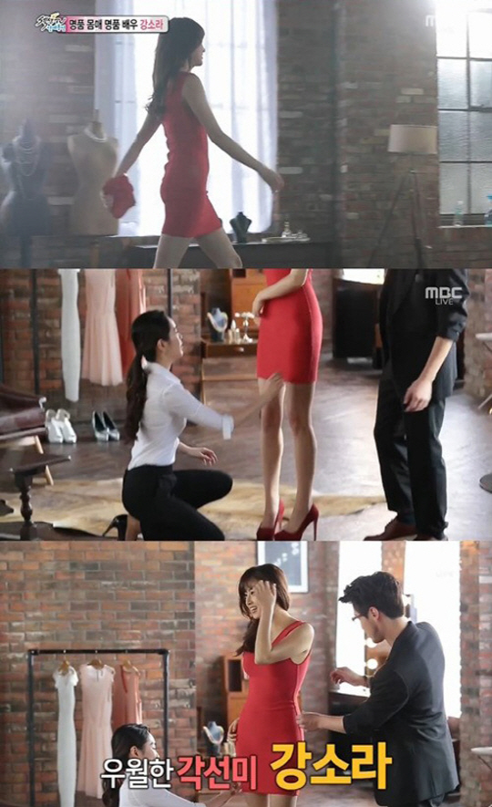 이날 시리얼 제품 광고를 촬영하던 강소라는 몸매가 드러나는 빨간색 원피스를 입고 등장, 완벽한 비율로 탄성을 자아냈다.