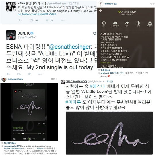 한편, 에스나는 두 번째 디지털앨범 'A Little lovin'을 발표하고 새로운 실력파 여성 싱어송라이터의 화려한 탄생을 알렸다.