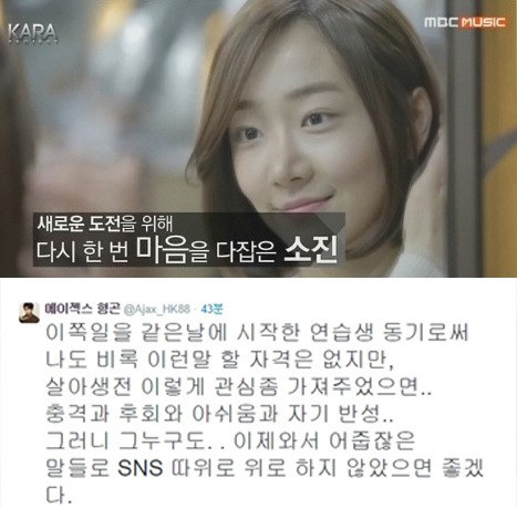 베이비카라 출신 소진의 사망 소식이 전해진 가운데, 같은 소속사 에이젝스 형곤의 SNS 글이 논란이 되고 있다.