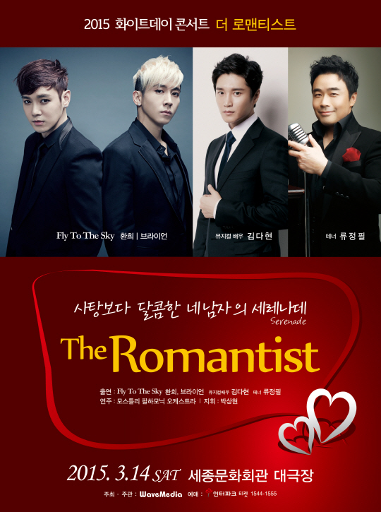 플라이투더스카이는 3월 14일 화이트데이를 맞아 콘서트 '더 로맨티스트'를 개최한다. '더 로맨티스트'는 플라이투더스카이, 야다 출신 뮤지컬 배우 김다현, 클래식계의 로맨티스트 류정필이 함께 만드는 콜라보레이션 공연이다. 여기에 모스틀리 필하모닉 오케스트라(지휘:박상현)의 연주가 더해져 화이트데이에 연인들을 위한 공연으로 주목받고 있다. 특히 플라이투더스카이가 세종문화회관 무대에 오른 것은 처음이라 기대가 쏠리고 있다. 세종문화회관은 대중가수에게는 대관이 어려운 공연장이다. 이에 이번 도전은 음악적 발전을 위한 신선한 노력으로 평가받고 있다.플라이투더스카이 역시 세종문화회관 첫 공연인 만큼 남다른 각오로 준비하고 있다는 후문. 이번 공연에서는 티켓 예매처인 인터파크와 주관사 SNS를 통해 출연진에게 듣고 싶은 노래를 신청받아 4명의 아티스트가 사연을 소개하고 노래를 들려주는 로맨틱 송 이벤트가 진행된다.