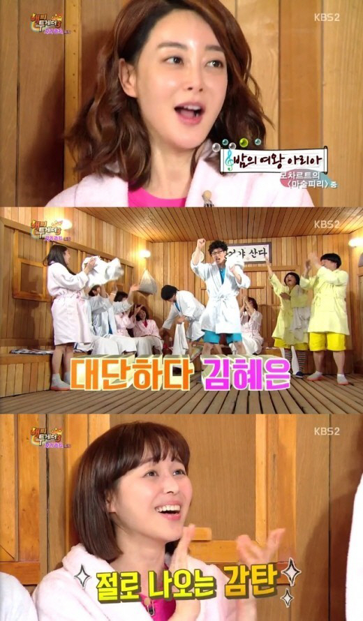 MC들은 김혜은은 성악 한곡을 불러 달라고 요청했고, "지금은 가능하지 않다"라며 주저했지만 이내 모차르트의 '밤의 여왕 아리아'를 열창했다.