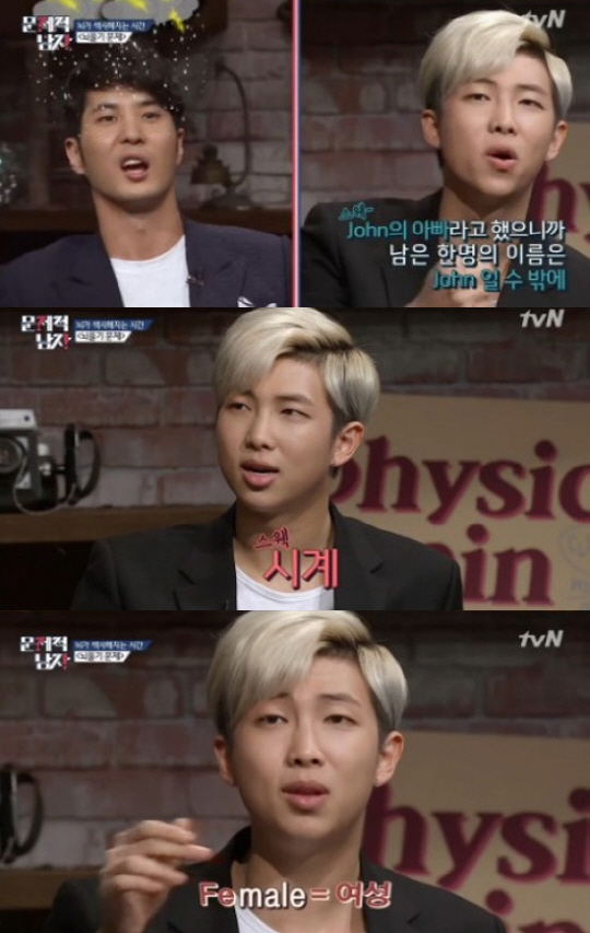 특히 '여자에게 철이 필요한 이유는 무엇인가'라는 질문에 다들 오답을 낸 반면 랩몬스터는 "Fe가 철인데, male하면 남성이니까 그래서 필요한 것 아니냐"고 제대로 풀이해 모두를 놀라게 했다.
