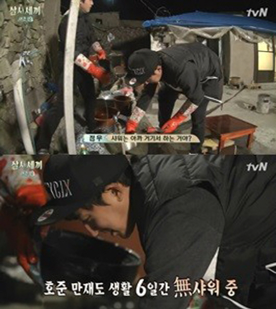 이날 방송에서 정우는 저녁 식사 후 손호준과 설거지를 하던 중 "샤워는 아까 거기서 하는거냐"라고 물었다.