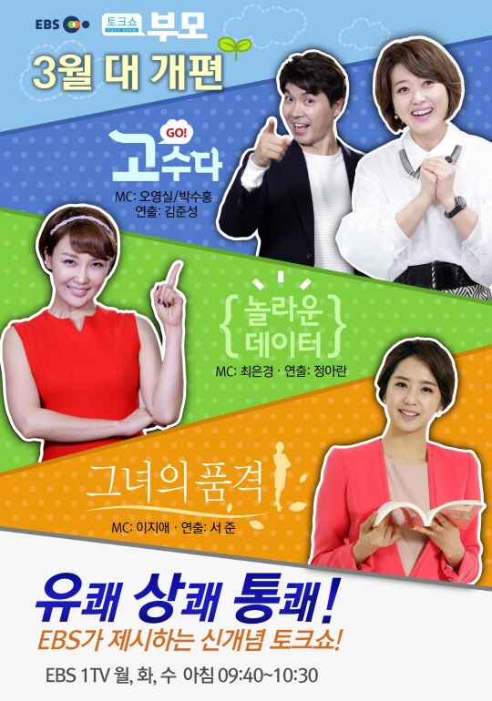 봄 개편과 함께 달라진 EBS '부모'는 매주 월요일부터 수요일 오전 9시 40분 방송되며, 요일별로 다른 컨셉트를 가진 집단 토크쇼로 진행된다. 뿐만 아니라 빅데이터를 활용한 정확한 정보와 새로운 시각을 제공해, 쌍방향 소통을 통한 살아 숨 쉬는 지식을 전한다.