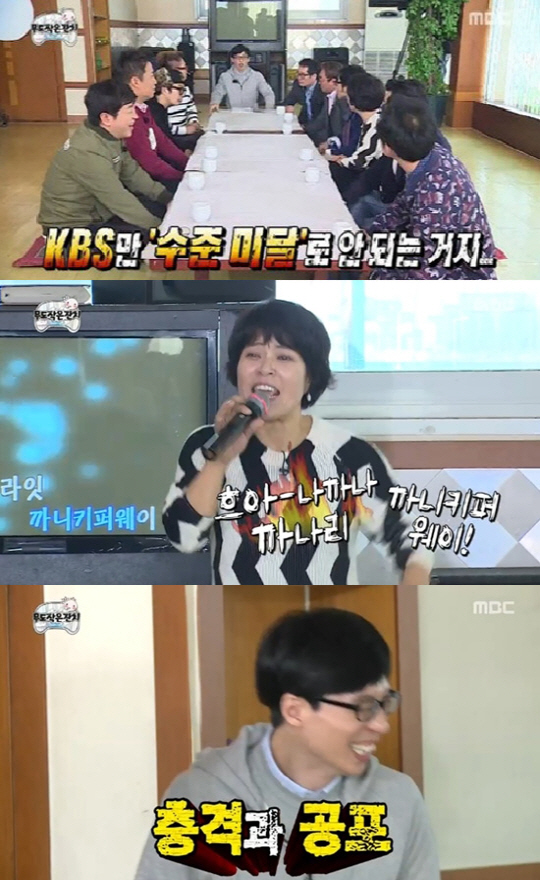 이날 방송에서는'무도작은잔치'에는 '황소와 줄다리기'에 도전했던 첫 회 이후 '무한도전'과 함께 했던 그룹 쿨 멤버 김성수, 개그맨 윤정수 표영호, 이윤석, 배우 이켠, 개그우먼 조혜련 등 6인이 함께 했다.